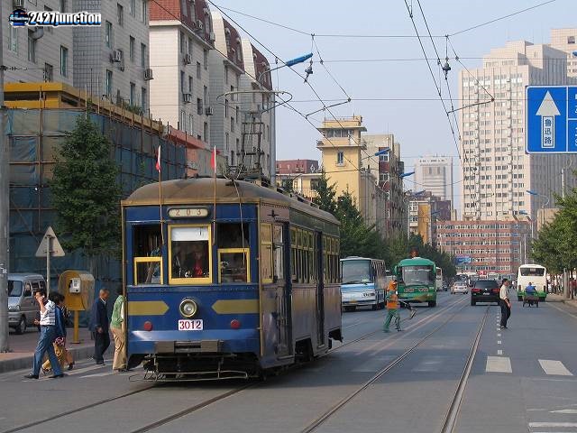 | 大連の市電(路面電車)は、現在、興工街〜小平島前 間(12.5km)を結ぶ202路と、大連火車站〜東海公園 間(6.6km)を結ぶ203路が営業運転を行っている。沙河口火車站〜大連火車站(4.9km)を結ぶ201路は現在全面改修工事のためバスによる代行運転を行っていて、2007年10月1日にリニューアル開通、同時に203路と直通運転を開始する予定である。なお、201路の沙河口火車站〜興工街 間は廃止となる。車両は満州国時代(日本統治時代)から活躍する古豪の3000型と、2001年から導入されている中国初の低床式電車であるDL6W型の2種類が主流となっている。2007年度に201路用のDL6W型が10編成増備される。運賃は1元均一(ICカードで乗車の場合は0.95元均一)。 |