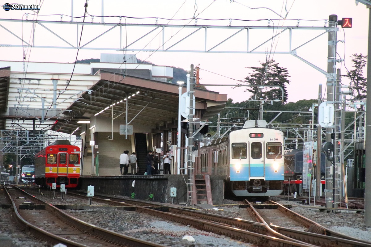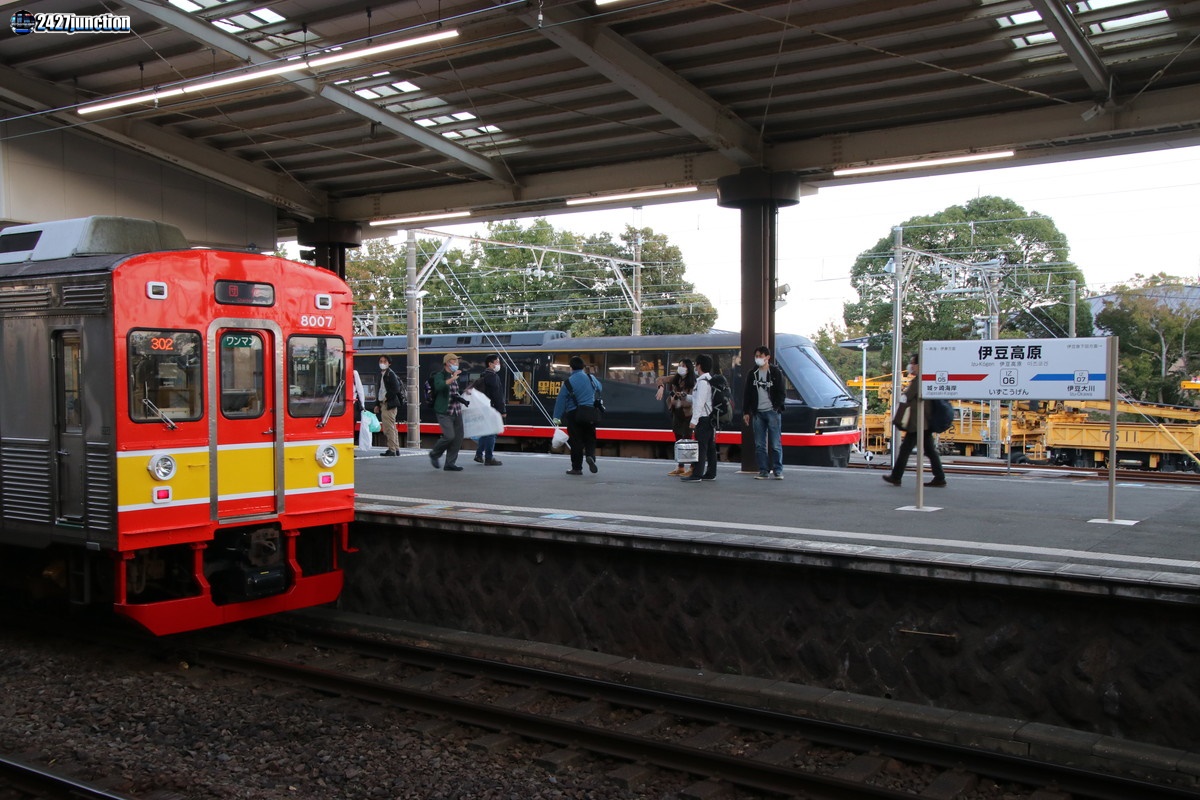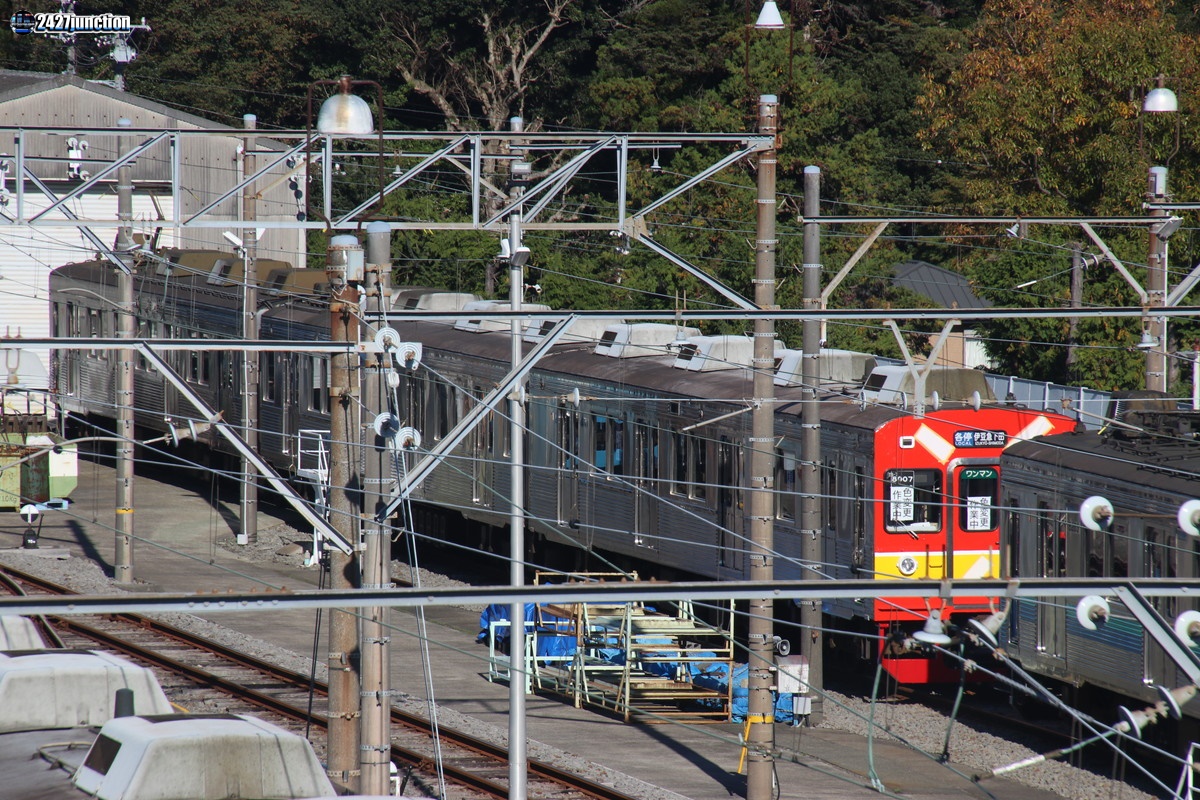 撮影会当日の朝。伊豆高原電車区に並ぶ2100系「THE ROYAL EXPRESS」や8000系の中に、ひときわ存在感が際立つ赤に黄帯の電車が鎮座していた。