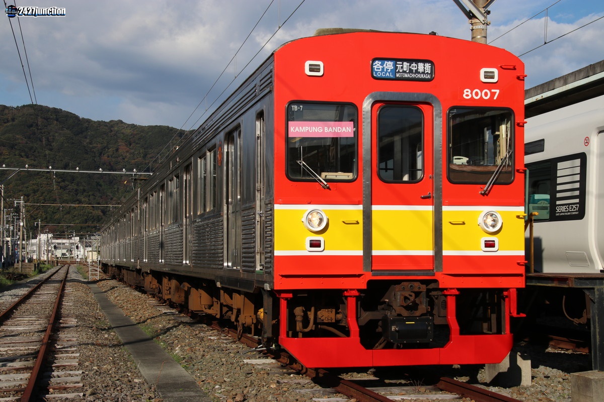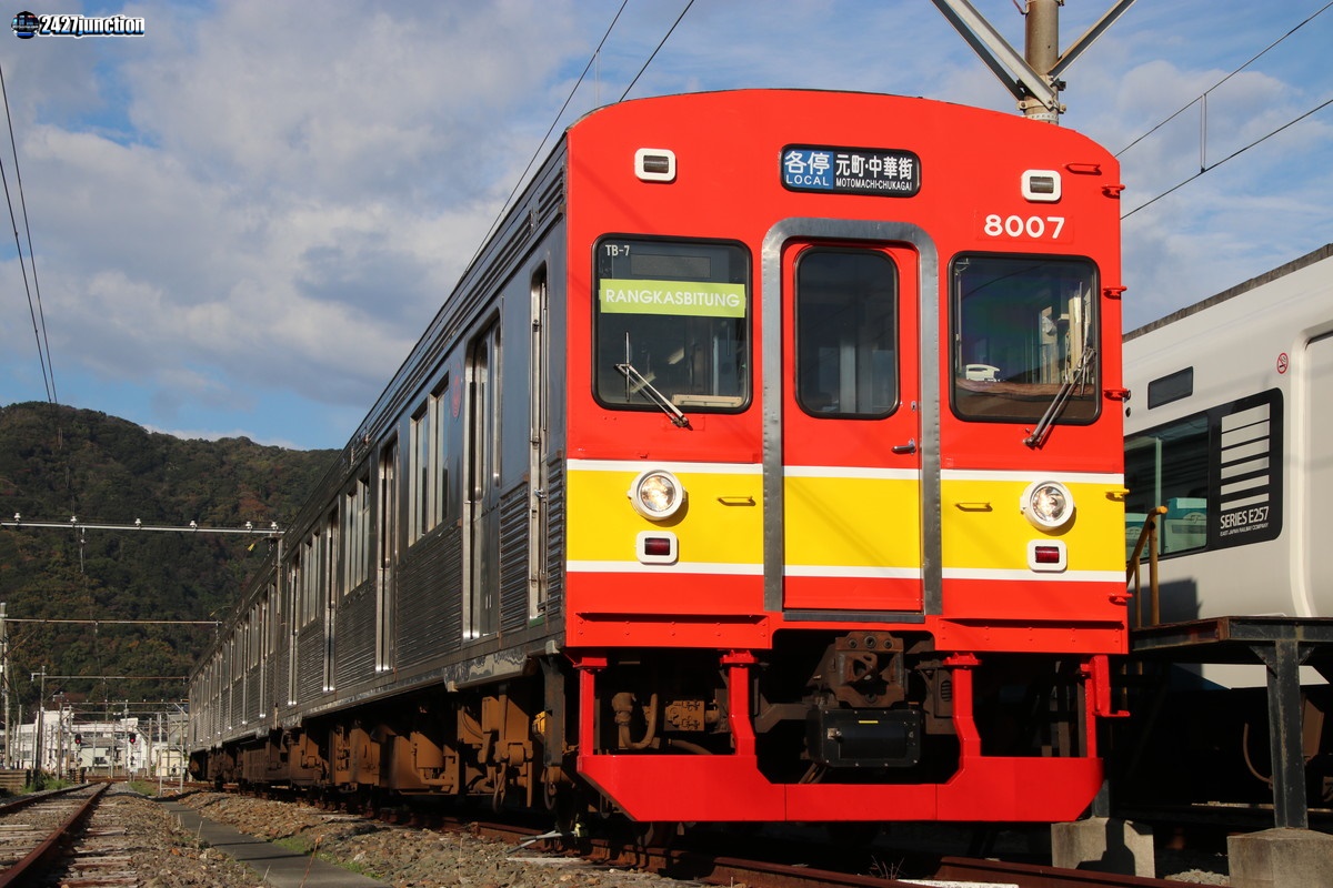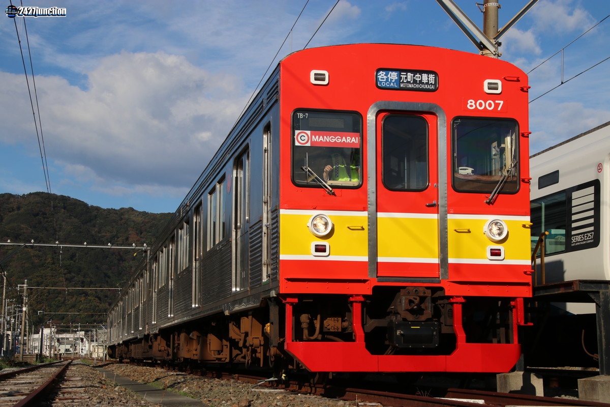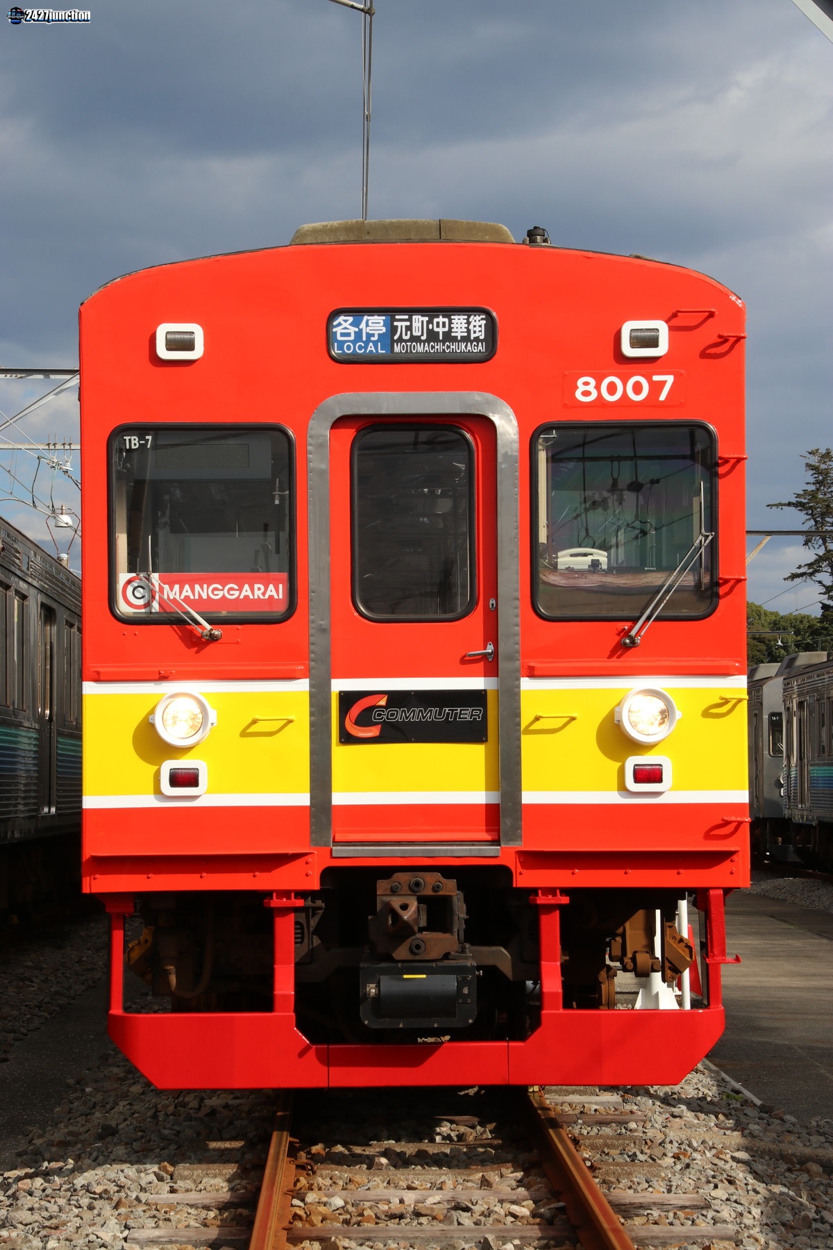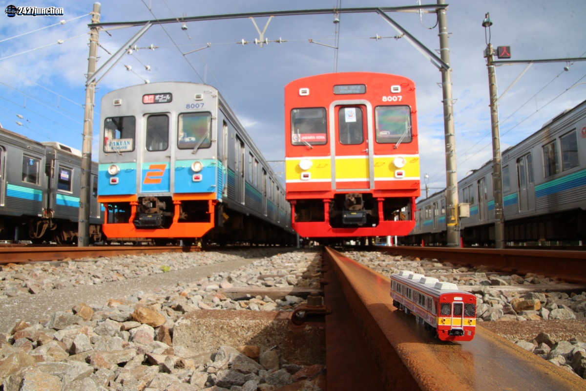 8007号車を真正面から。前面をKCIカラーにフルラッピングし、スカート周りを赤色に、ライトケース周りを白色に塗装した。車両番号はKCIの8003Fのように、東急時代のフォントのものが再現されている(参考までに実際の8007号車は2021年現在、黄色の帯が細帯仕様である)。