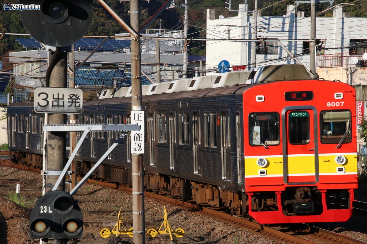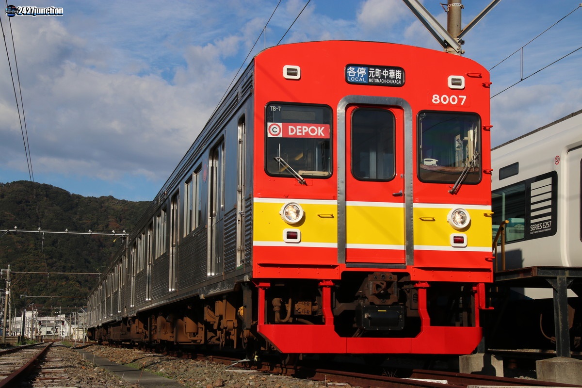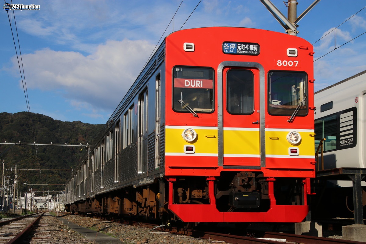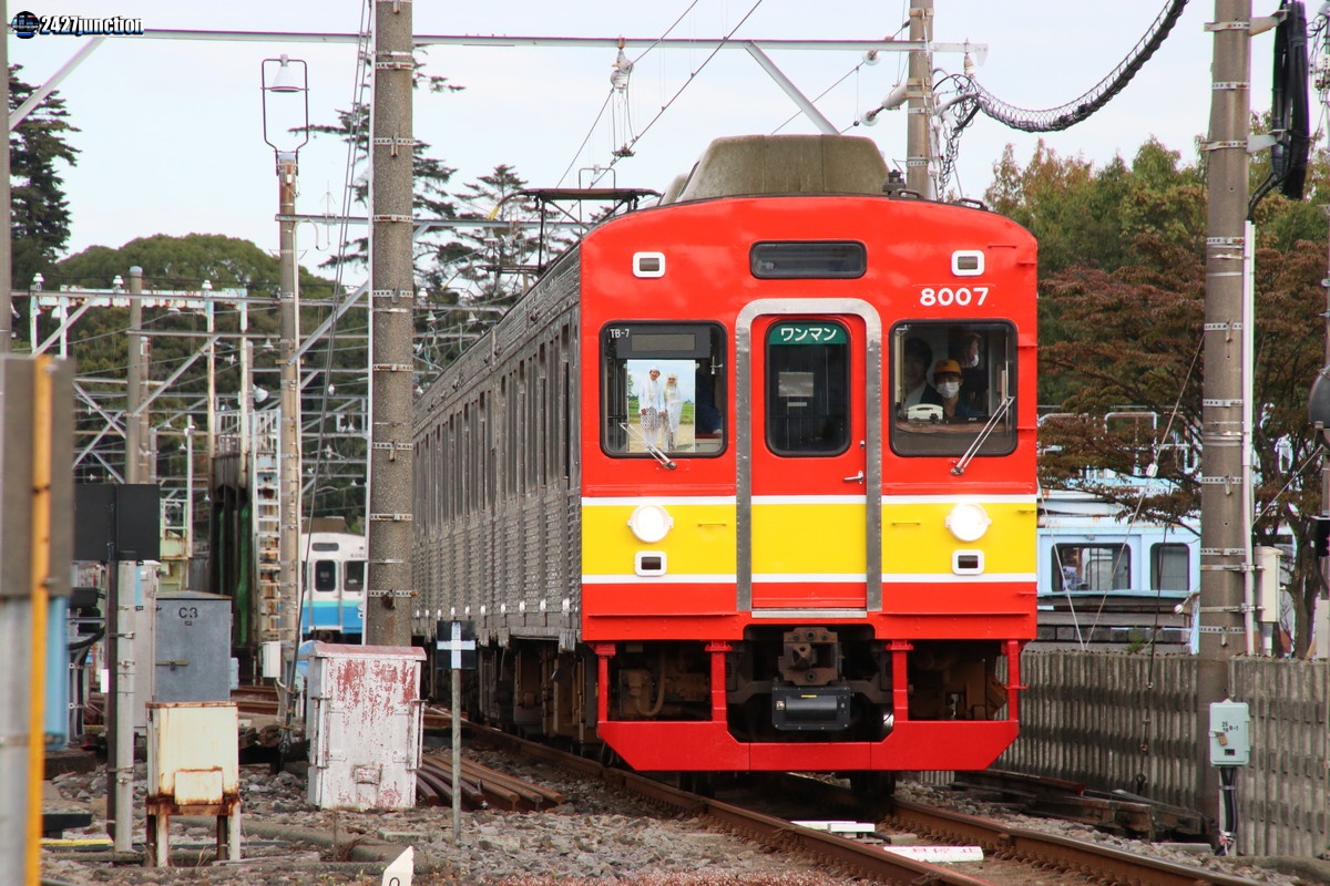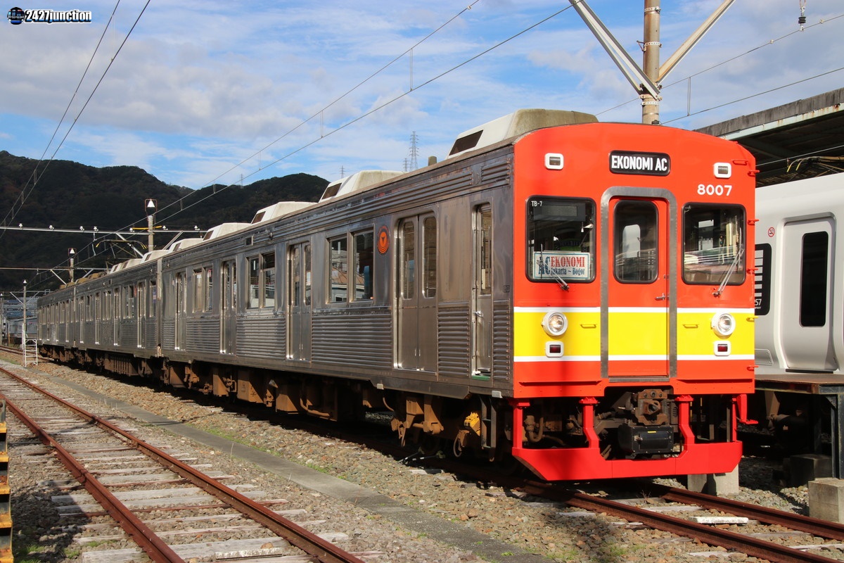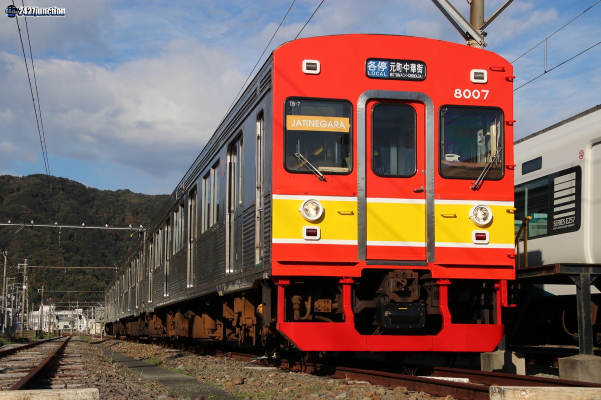 8007号車を真正面から。前面をKCIカラーにフルラッピングし、スカート周りを赤色に、ライトケース周りを白色に塗装した。車両番号はKCIの8003Fのように、東急時代のフォントのものが再現されている(参考までに実際の8007号車は2021年現在、黄色の帯が細帯仕様である)。