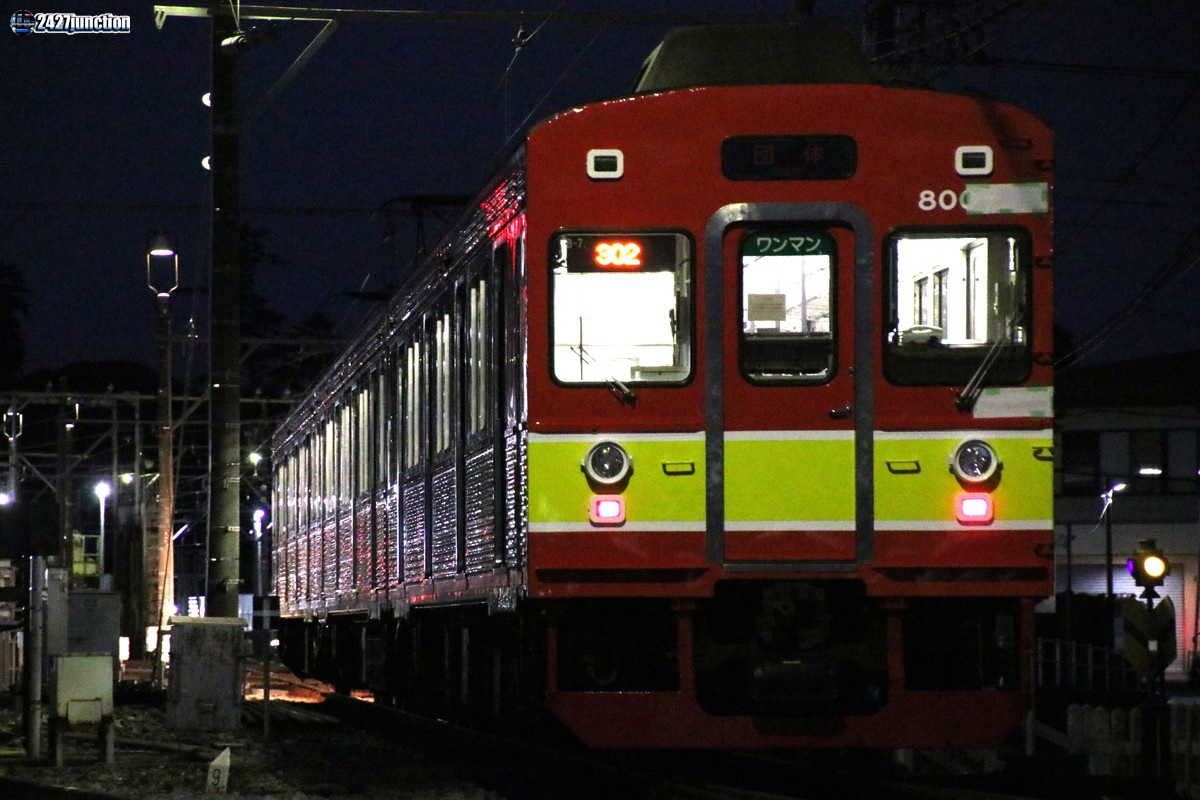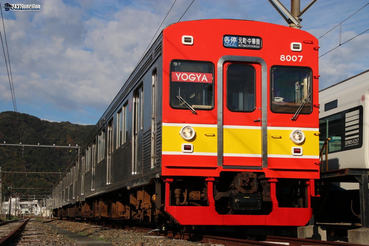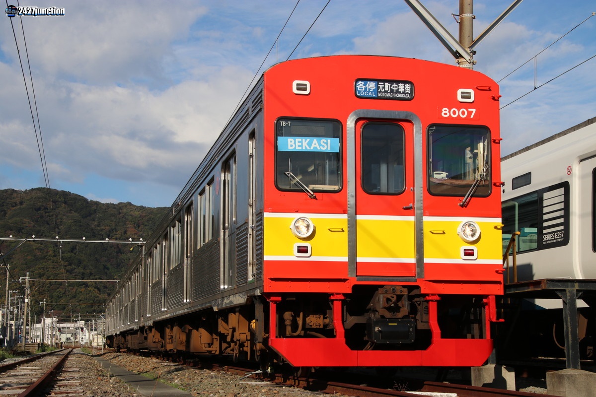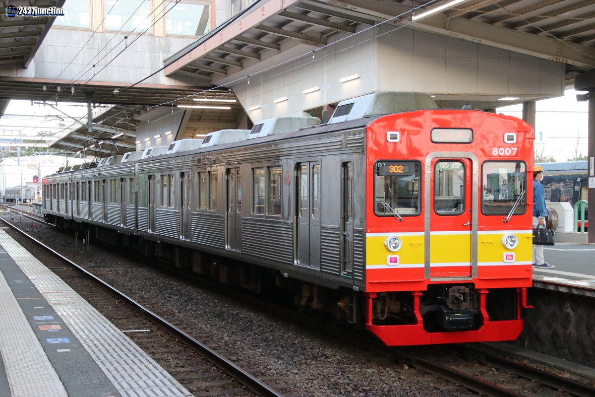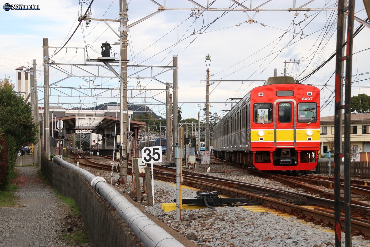 8007号車を真正面から。前面をKCIカラーにフルラッピングし、スカート周りを赤色に、ライトケース周りを白色に塗装した。車両番号はKCIの8003Fのように、東急時代のフォントのものが再現されている(参考までに実際の8007号車は2021年現在、黄色の帯が細帯仕様である)。