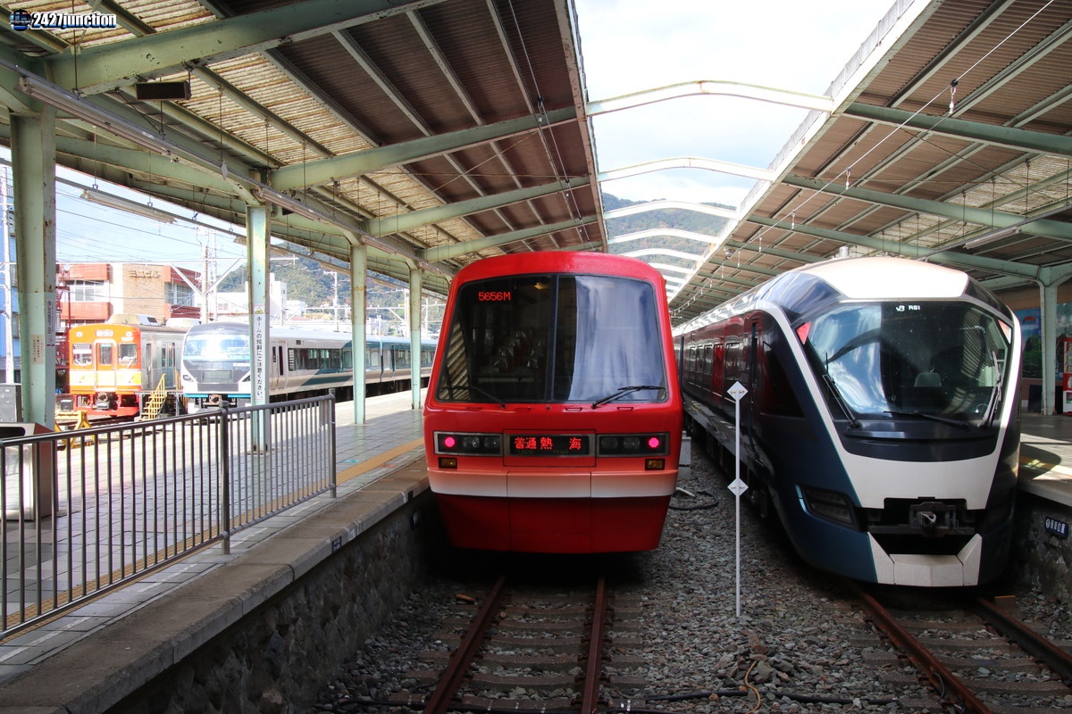 伊豆急下田駅構内にて撮影会第2段(TB-7編成撮影会)開始。隣には留置中のE257系2000番台(NA-02編成)が並ぶ。