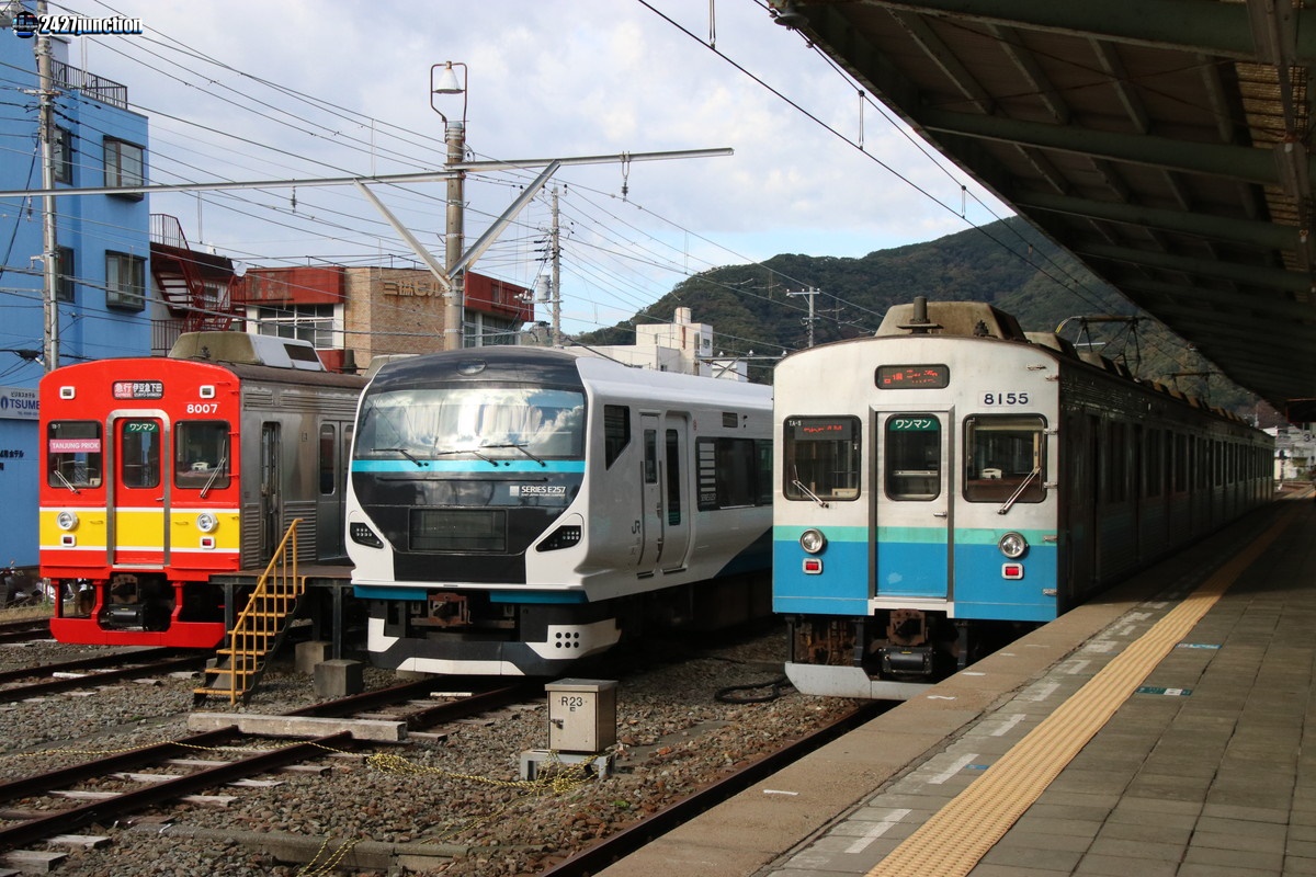 E257系の両側に並ぶ、2色の8000系。この日限りの特別な並びである。