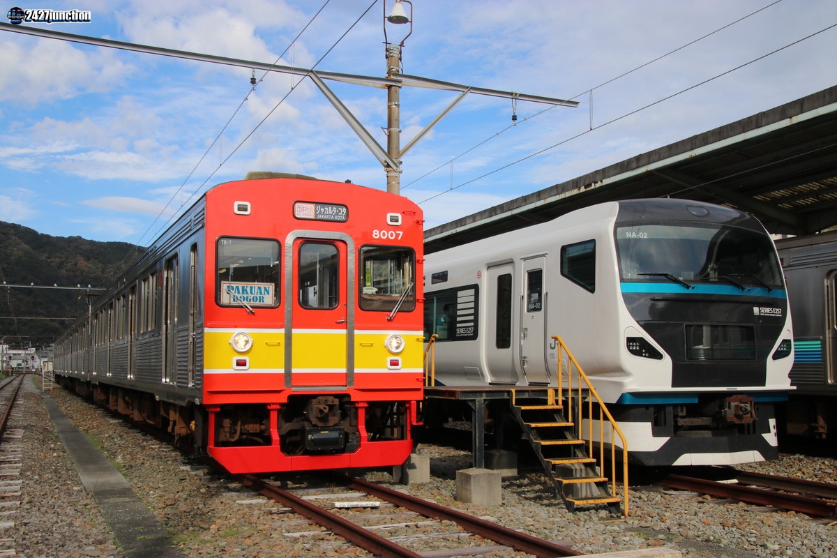 2021年11月14日に向けて、伊豆高原電車区にて縦列でラッピング・塗装作業が進められるTB-3編成8003号車とTB-7編成8007号車。ラッピング・塗装作業は2021年11月11日頃より開始された(スカートは塗装、車体前面はラッピングにて施工)。