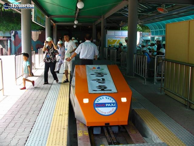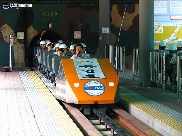 ![]() | 地上の乗り場に到着した南侵第3トンネルへのトロッコ。「統一号(トンイルホ)」と命名されている。 |