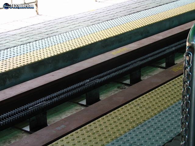 ![]() | トロッコの軌道。中心にはトロッコ駆動用の歯車が設置されている。 |