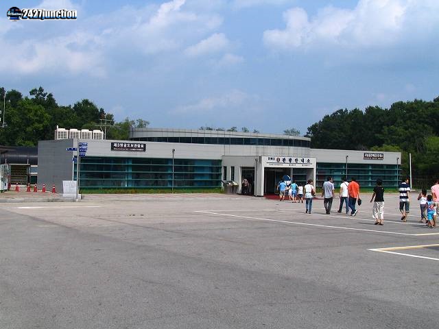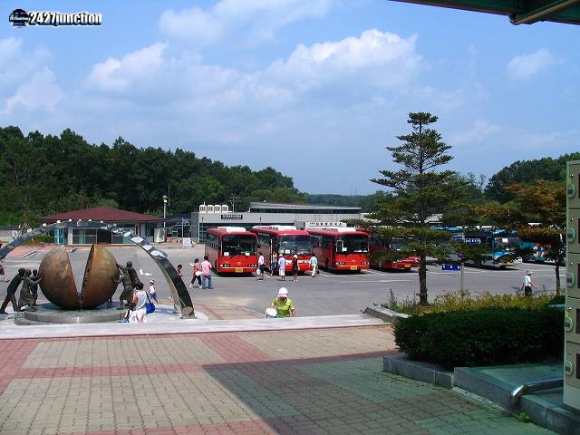 ![]() | トロッコ乗り場から見た観光バス発着広場。赤いバスが都羅山駅前発着のDMZ観光用のバスである。 |