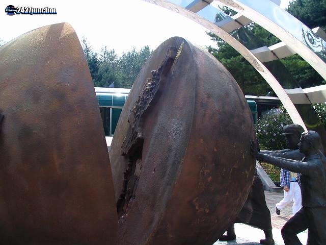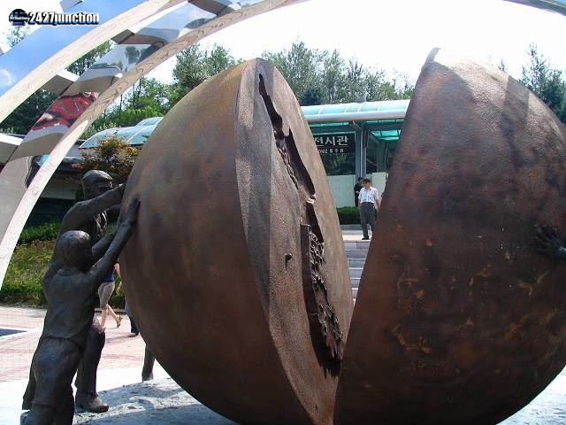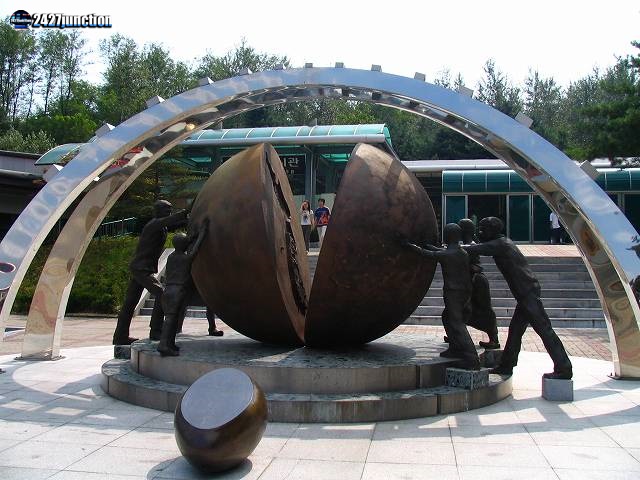 ![]() | モニュメントは、2つに分離された朝鮮半島の南北(球の片側は韓国、もう一方は北朝鮮を示している)を国民の手で再統一しようという願いをこめたものである。 |