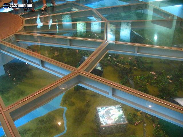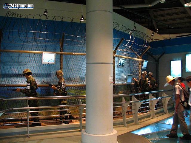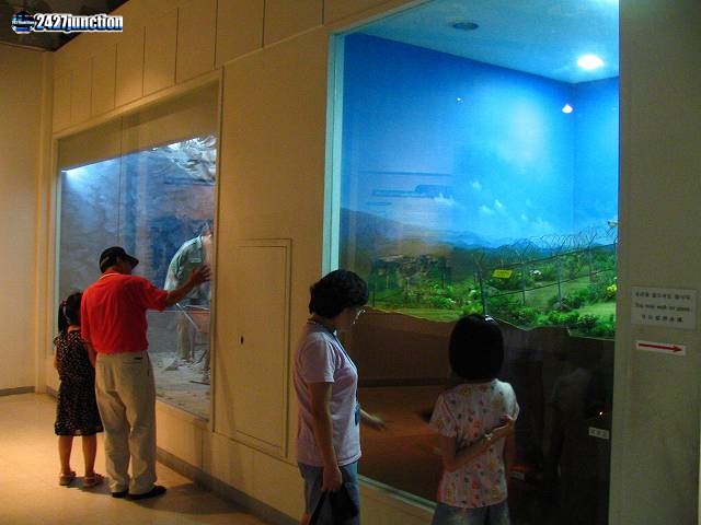 ![]() | 一部は床が透けており、そこにDMZ内の様子が模型で再現されている。解説によると、DMZ内は無数の地雷が植わっており、そのため人が寄り付かず、現在は貴重な野生生物が数多く生息しているという。 |
