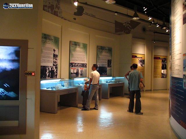 ![]() | トロッコ乗り場の横に位置する、DMZ映像館・展示館の内部。客はまず大型スクリーンで放映されるDMZに関するショートムービー(日本人の場合は入口で無線イヤホンを貸してくれて、内容が日本語で同時翻訳される)を観賞し、その後に展示館を見学する順路となっている。 |