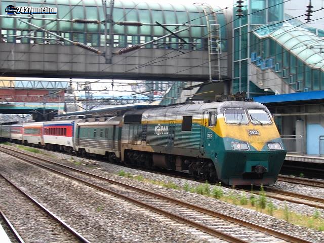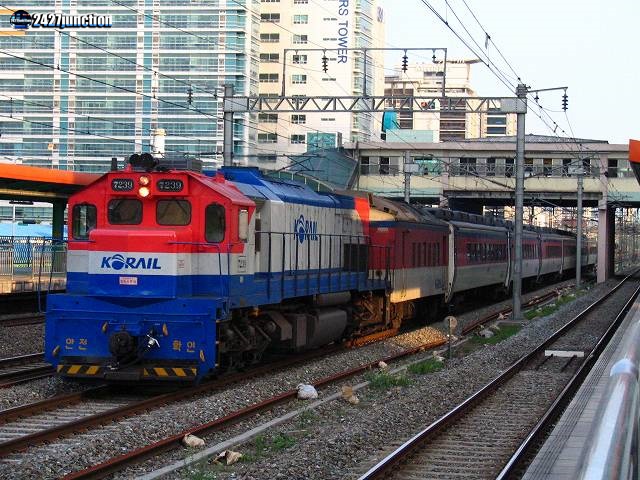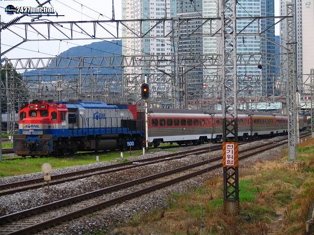 ![]() | 京釜線の複々線区間を快走するムグンファ号。機関車・客車ともに新塗装化が完了した編成である。 加山デジタル団地にて |