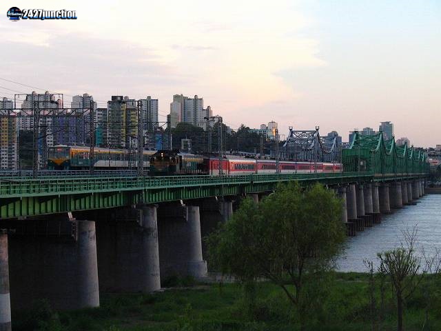 ![]() | 漢江を渡るムグンファ号。京釜電鉄線の1000系中期抵抗車と離合する。 |