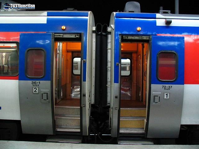 ![]() | ドア付近。韓国では広域電鉄・地下鉄を除いてホームが低いため、車両にはステップがついている。また、幌にはダンパー機能があるため、日本の客車と違い発車時などに不快な振動は全くなく、乗り心地は優れている。 |