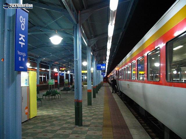 ![]() | 栄州に停車中のムグンファ号。寝台車は現在は定期列車には連結されておらず、夜行列車でも座席車のみ。ただ、夜行列車でも車内販売サービスはある。 |