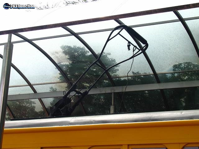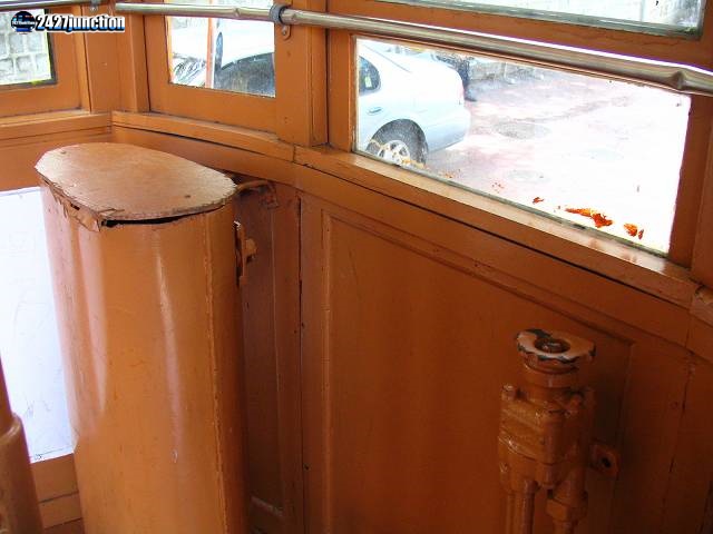 ![]() | 車内の様子。天井の一部が腐食により抜け落ちそうな状況であり、状態は悪い。車内は一般公開していない。 |