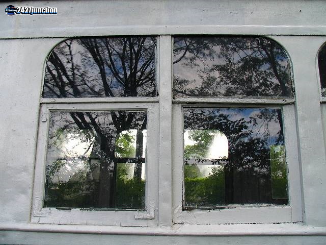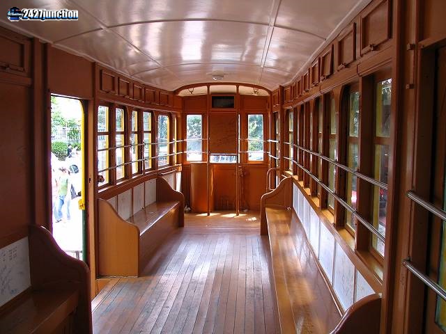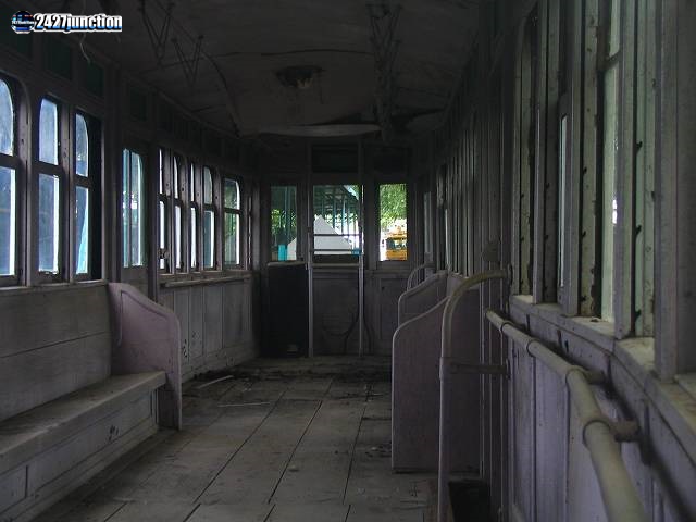 ![]() | 車内の様子。座席が木製化されている。状態はよいが、一般に公開しているためか、壁に落書きがあるのは残念だ。 |