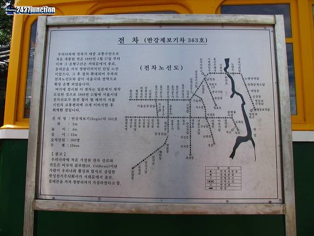 | 1968年11月29日に全廃されたソウルの市電(路面電車)の車両が、現在「国立ソウル科学館」と「オリニ大公園」に保存されている。車両はいずれも日本製(「オリニ大公園」のものは日本車両製、「国立ソウル科学館」のものはメーカー不詳)である。 関連ページ:ソウル市電381号 復元 |
