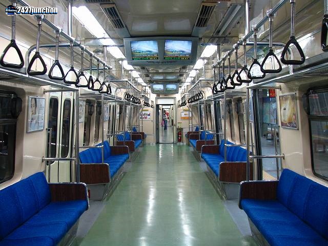 ![]() | ソウル交通公社3000系不燃化改造施工車車内(座席および化粧版・袖仕切・床敷物・ラインデリア等がすべて不燃性・難燃性の物に交換されている)。ソウル交通公社3000系は車体断面が台形なのが特徴である。車幅も3,160mmと、ソウル地下鉄の標準幅3,120mmよりも広い。2002年に各車両にLCDを8基設置。広告・次駅案内・乗換え案内・行先等を表示する。 |