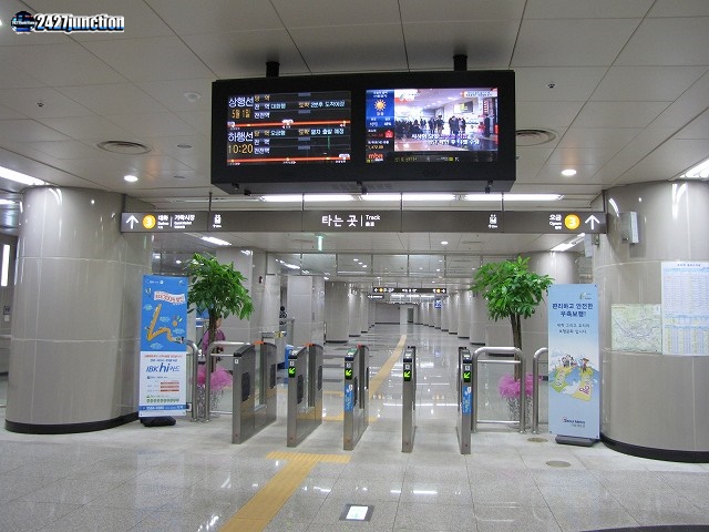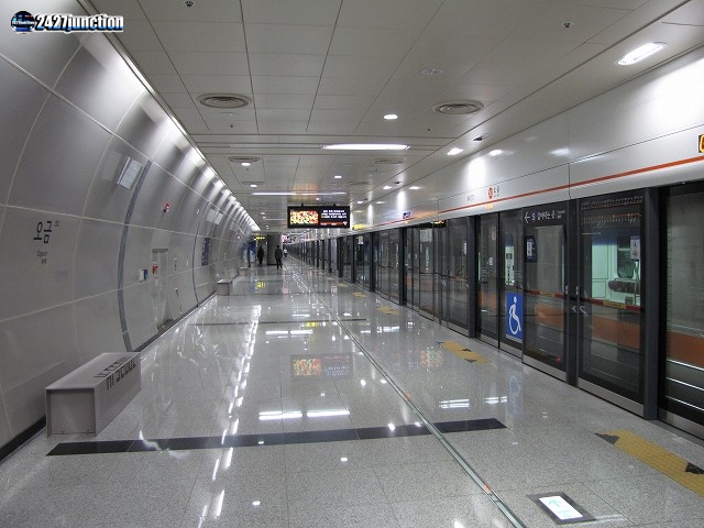 ![]() | 2010年2月18日に開業した可楽市場・警察病院・梧琴の3駅は、ホームのデザインや案内標識が地下鉄9号線の駅をベースとしたものになっている。プラットホームスクリーンドア(PSD)は開業時から設置。 |